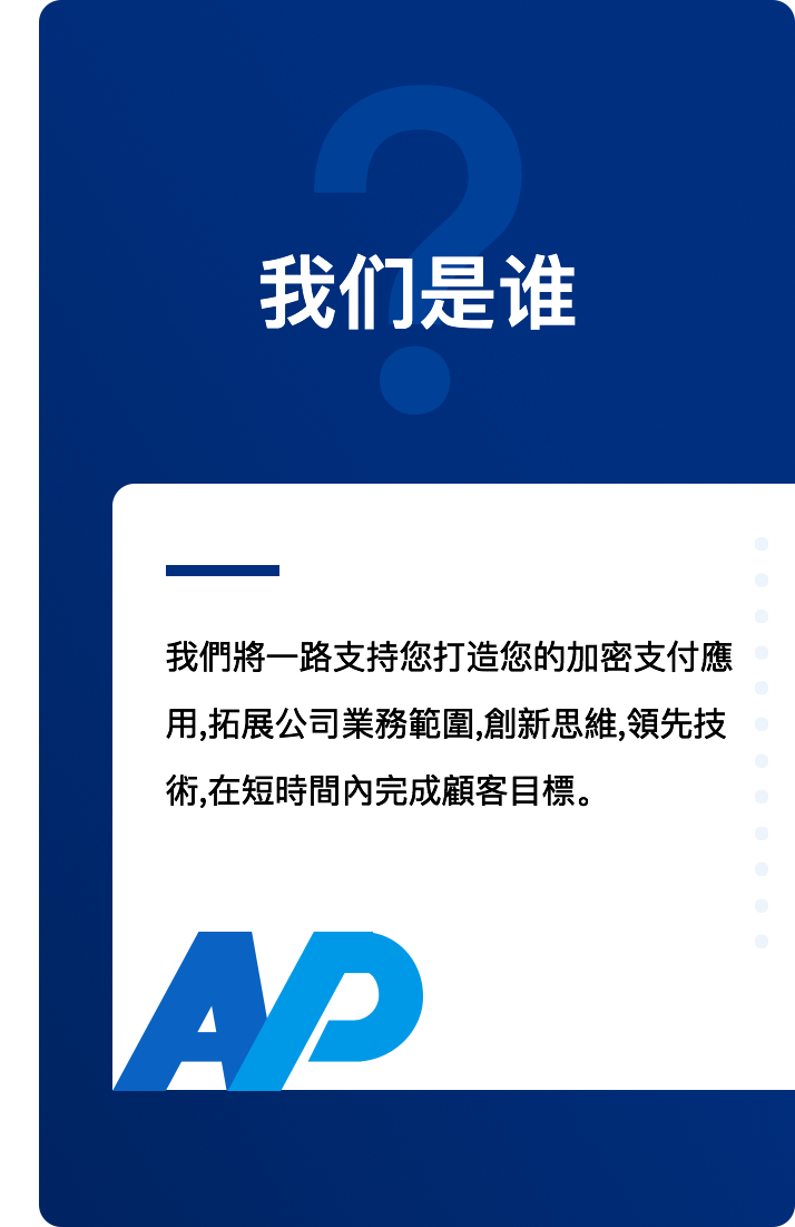 不段滿足客戶期望以及需求,為客戶建立全球最棒的第三方支付系統!不段精進技術,提供最棒的虛擬貨幣第三方支付系統,成為全球最頂尖的平台公司!讓您輕鬆接收USDT等虛擬貨幣!